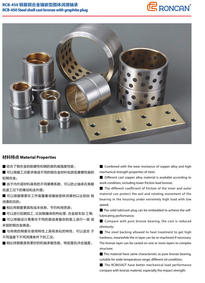 RCB450結(jié)合了金屬與非金屬的優(yōu)點(diǎn),特別適合于高載低速而又無法加油或不能加油的工作場(chǎng)合,如大型港口機(jī)械、軋鋼機(jī)械、模具行業(yè)以及沖壓設(shè)備等。