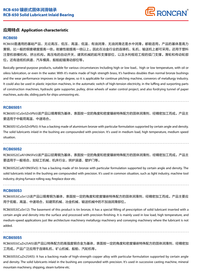 RCB650是通用的基礎(chǔ)產(chǎn)品,無論高壓、低壓、高溫、低溫、有油潤滑、無油潤滑還是水中潤滑。都能適用。產(chǎn)品的基體是高力黃銅,比一般的銅套硬度提高一倍。耐磨性能提高一倍以上。因此在冶金行業(yè)的連鑄機(jī)、軋機(jī)、輸送機(jī)上都可采用。還用于塑料注塑機(jī)鎖模機(jī)構(gòu),擠出機(jī)構(gòu)。高壓電的自動開關(guān),建筑機(jī)械的起吊支撐部位,以及水利樞紐工程的弧門支撐?;喓蛡鲃虞啿课弧_€有造紙機(jī)烘道、汽車模具、船舶起錨滑動部位等。